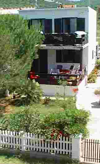Frau Osmic bietet in drei Schlafzimmern sechs Personen Platz. Von Balkon aus kann man auf die Bucht von Stara Novalja blicken; die Terasse im Ergeschoß liegt hingegen im Schatten. |